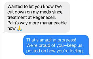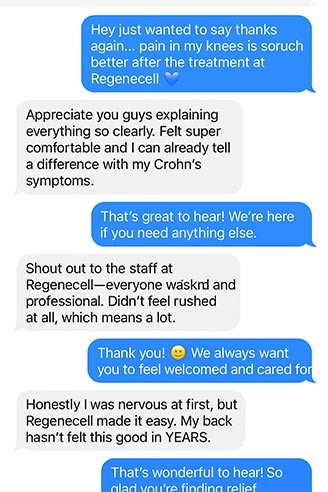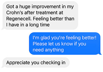 “I’ve battled Crohn’s disease for over a decade, and after my treatment, my flare-ups have become less frequent and less severe. Regenecell’s team guided me every step of the way and answered all of my questions leaving me feeling confident in my decision.”